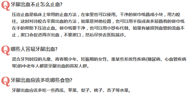 由于牙齿四周的组织病变,使牙龈水肿、毛细血管扩张充血,一旦咀嚼较硬的食物或刷牙不当时,常会引起牙龈出血。